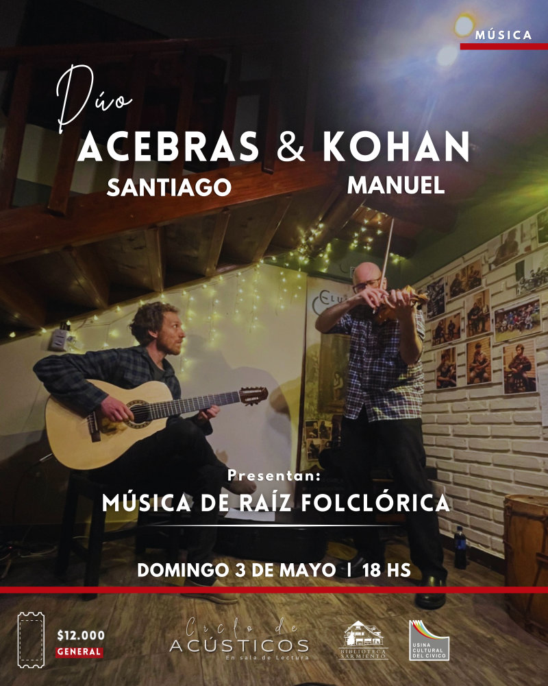 ☀️El dúo formado por Santiago Acebras (violín) y Manuel Kohan (guitarra de 7 cuerdas) propone un viaje por la música argentina, desde el chamamé hasta la zamba, pasando por chacareras, bailecitos y tangos.Músicas de Ariel Ramírez, Ángel Villoldo, Raúl Barboza, Sebastián Piana y Eduardo Falú, entre otros grandes.